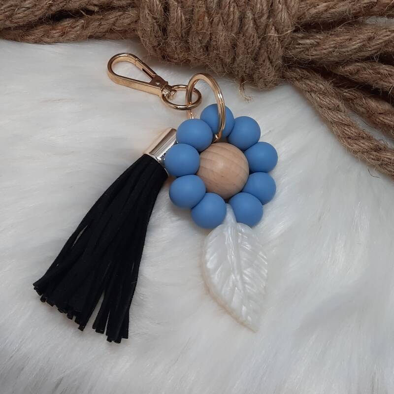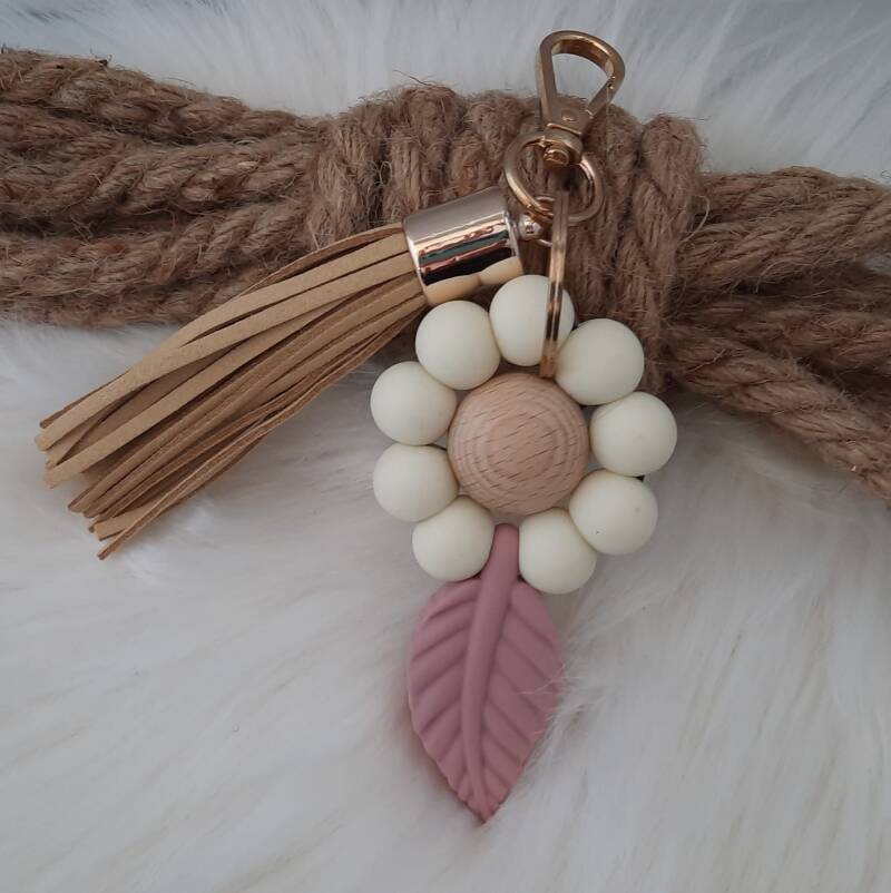 Leuke handgemaakte sleutelhanger van een bloem met een silicone blaadje en een suède kwastje. Verkrijgbaar in verschillende kleuren.
